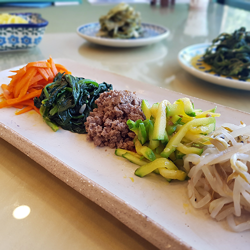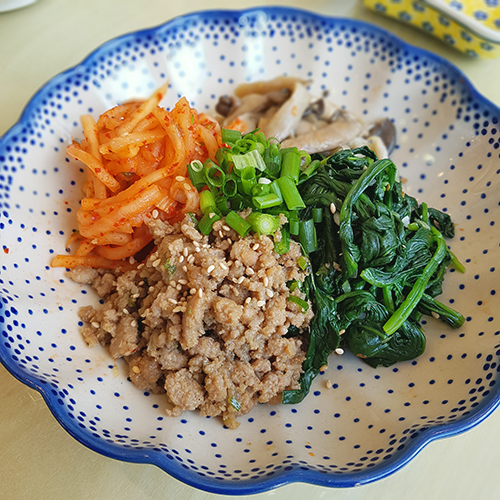 양념소고기, 당근채와 콩나물, 애호박 , 시금치나물, 양념간장 쓱쓱 비벼만 주세요^^ (소고기: 호주산)