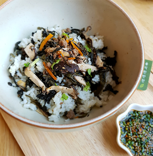 으뜸 산나물 곤드레, 느타리버섯, 양념소고기, 솔찬 맛간장. *밥제외 (곤드레: 국내산 / 소고기: 호주산 / 느타리버섯: 국내산)