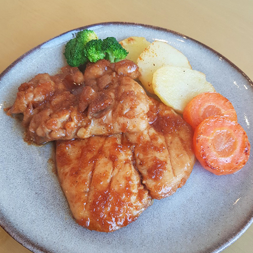 친환경 닭다리와 닭가슴 순살을 구워서 바베큐폭립소스에 조려내었습니다. 야채가니쉬와 메쉬포테이토가 함께 있습니다. (닭고기 : 국내산 친환경)